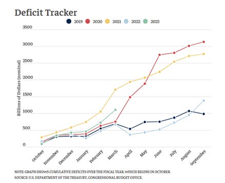 As noted last month, for FY23 the US Federal Budget Deficit is budgeted to be $1.4tn. However, as at March the deficit is already $1.1trn and with a lower expected tax season (much less cap gains), it is unlikely the full year will end the year anywhere near below $1.4trn. This is an economic tailwind and could forestall a recession (but prolong “inflation”)