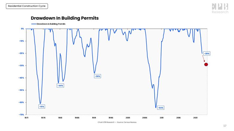 US housing activity appears to be rolling over. Drawdown in building permits is a good leading indicator of future activity. Flashing orange.